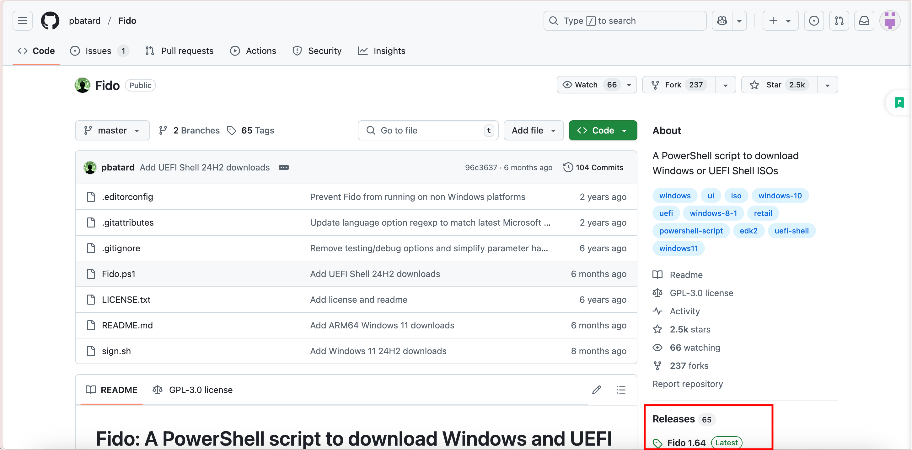 Fido 是一个 PowerShell 脚本,主要用于 Rufus,但 也可以独立使用,其目的是自动访问 Microsoft Windows 官方零售 ISO 下载链接,并提供对可启动 UEFI Shell 映像的便捷访问。