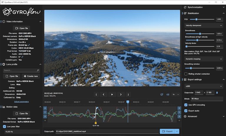 Gyroflow 是一个应用程序,可以通过使用来自陀螺仪和可选的加速度计的运动数据来稳定您的视频。现代相机在内部记录这些数据(GoPro、Sony、Insta360 等),并且此应用程序通过使用它们来精确稳定捕获的素材。它还可以使用来自外部来源的陀螺仪数据(例如,来自 Betaflight 黑匣子)。