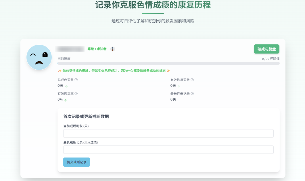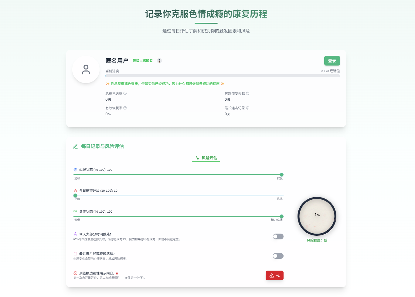 记录你克服色情成瘾的康复历程,通过每日评估了解和识别你的触发因素和风险