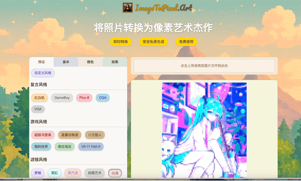 即时转换:即时将图像转换为像素艺术。我们强大的引擎可在几秒钟内将您的图片变成像素艺术。