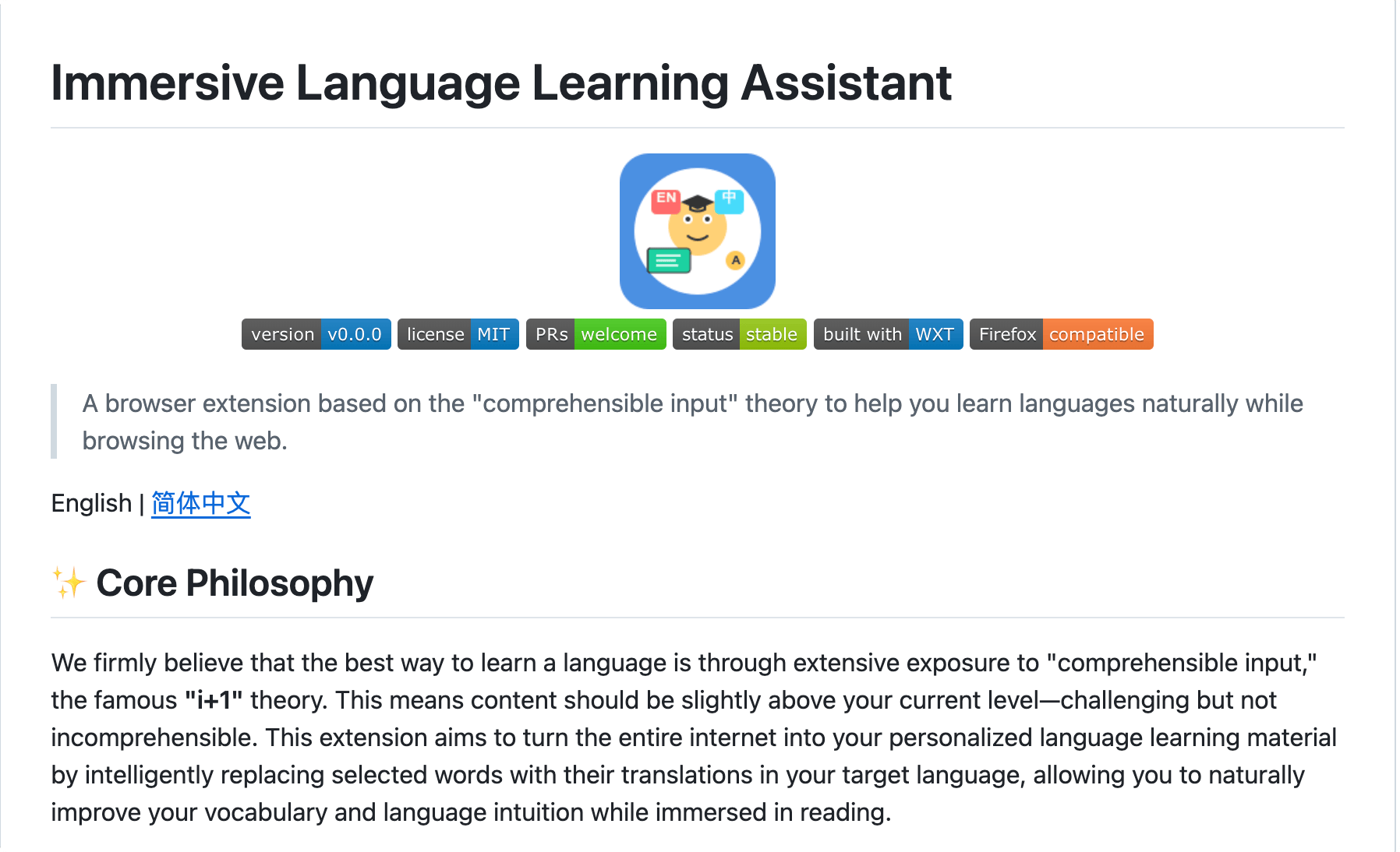 浸入式学语言助手,一款基于”可理解输入”理论的浏览器扩展,帮助你在日常网页浏览中自然地学习语言。