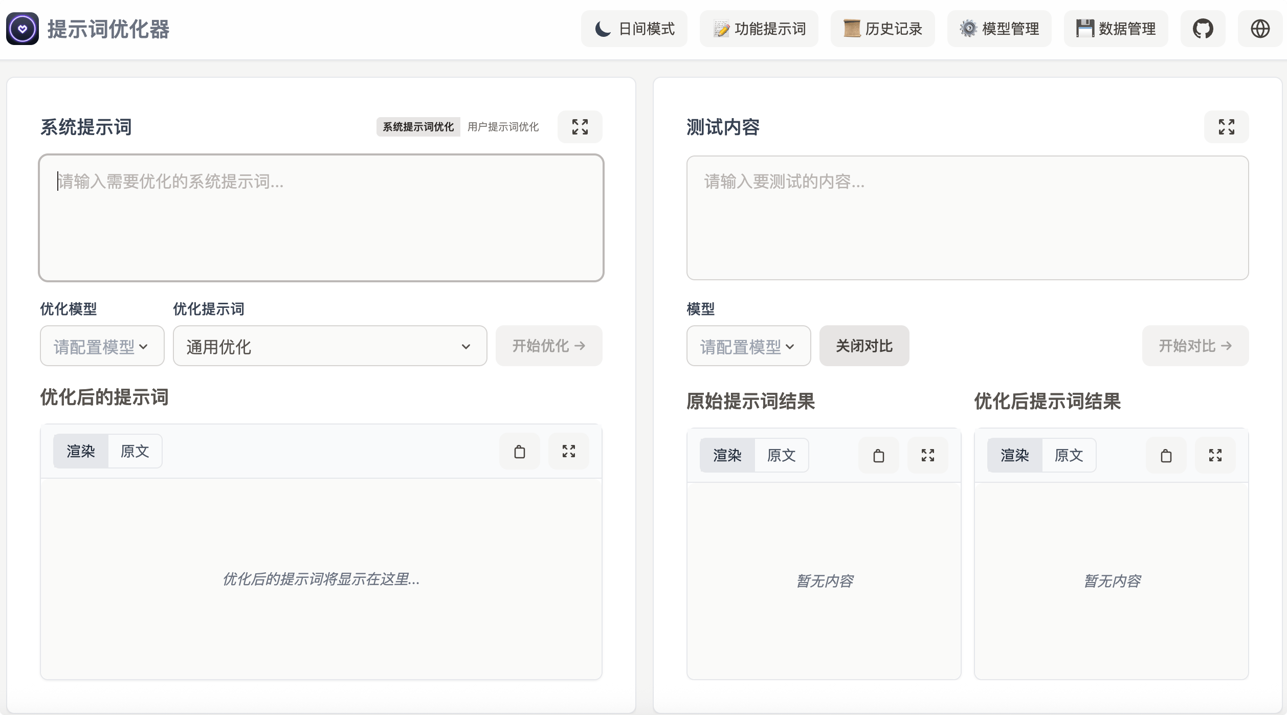- 🔄 对比测试:支持原始提示词和优化后提示词的实时对比,直观展示优化效果
