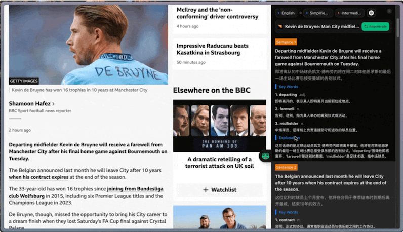 无论您在阅读新闻、文章还是任何网络内容,Read Frog 都能帮助您深入理解和学习语言。就像在浏览器中拥有一位语言老师。非常适用于希望通过真实内容学习语言的语言学习者,希望更好理解外语文章的读者和任何想让网络浏览更具教育意义的人。
