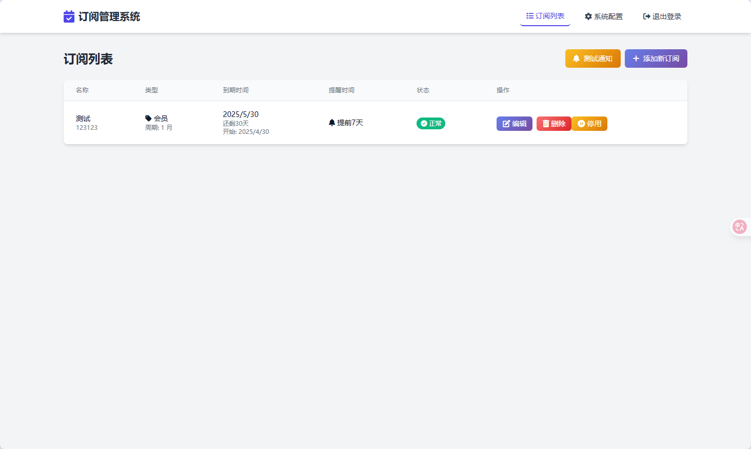 - 状态管理:订阅启用/停用,过期状态自动识别