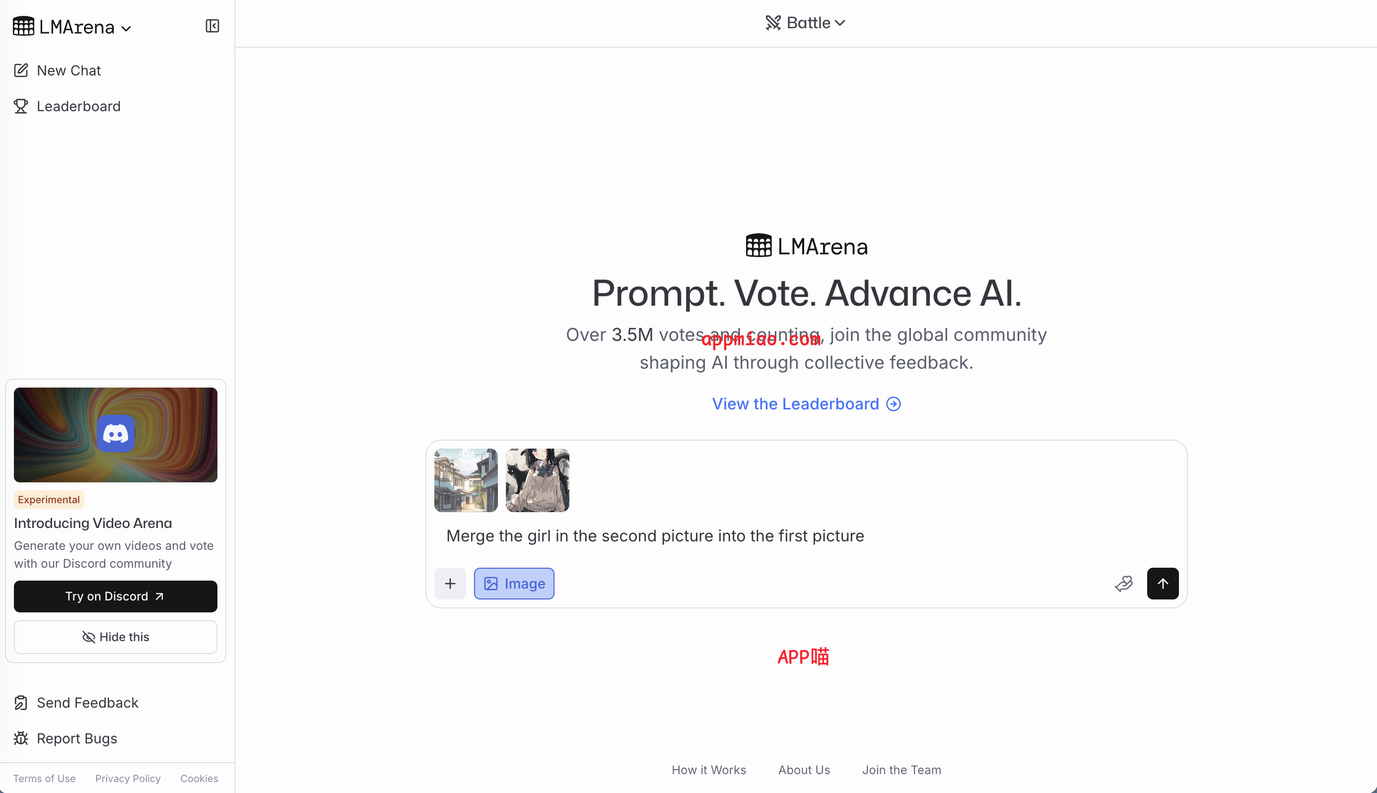 打开 lmarena ai,进入页面后找 Image Edit 或 Battle 入口,核心是“随机匹配匿名模型”,它不会告诉你使用了哪个模型去生成的图片,等你选择满意图片后才会告诉你!阿喵我试了几次,基本上让人满意的都是nano banana。左边一般是chatgpt或者谷歌gemini等