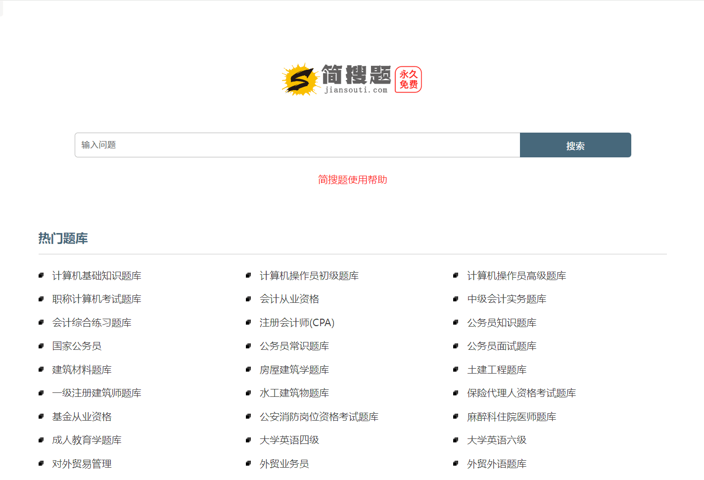 简搜题是一个无广告、专业的在线搜题学习工具,旨在为学生和职业资格考试者提供广泛的考试题目和答案解析,支持多种题型,包括选择题、填空题和问答解析题,且服务完全免费,无需注册,点击即可使用。