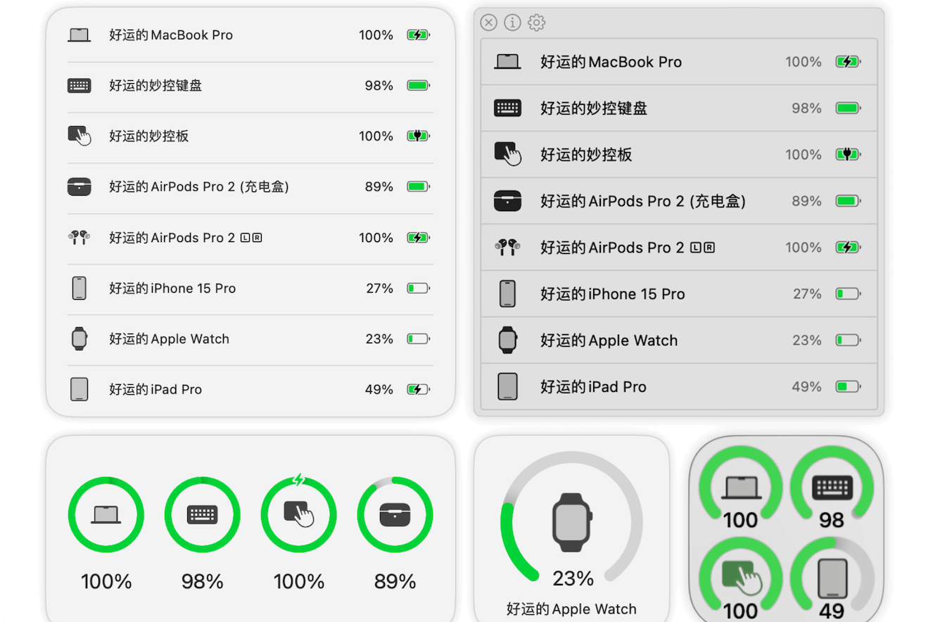 - 多设备电池监控:自动检测并显示 iPhone、iPad、Apple Watch 等苹果设备的电池电量