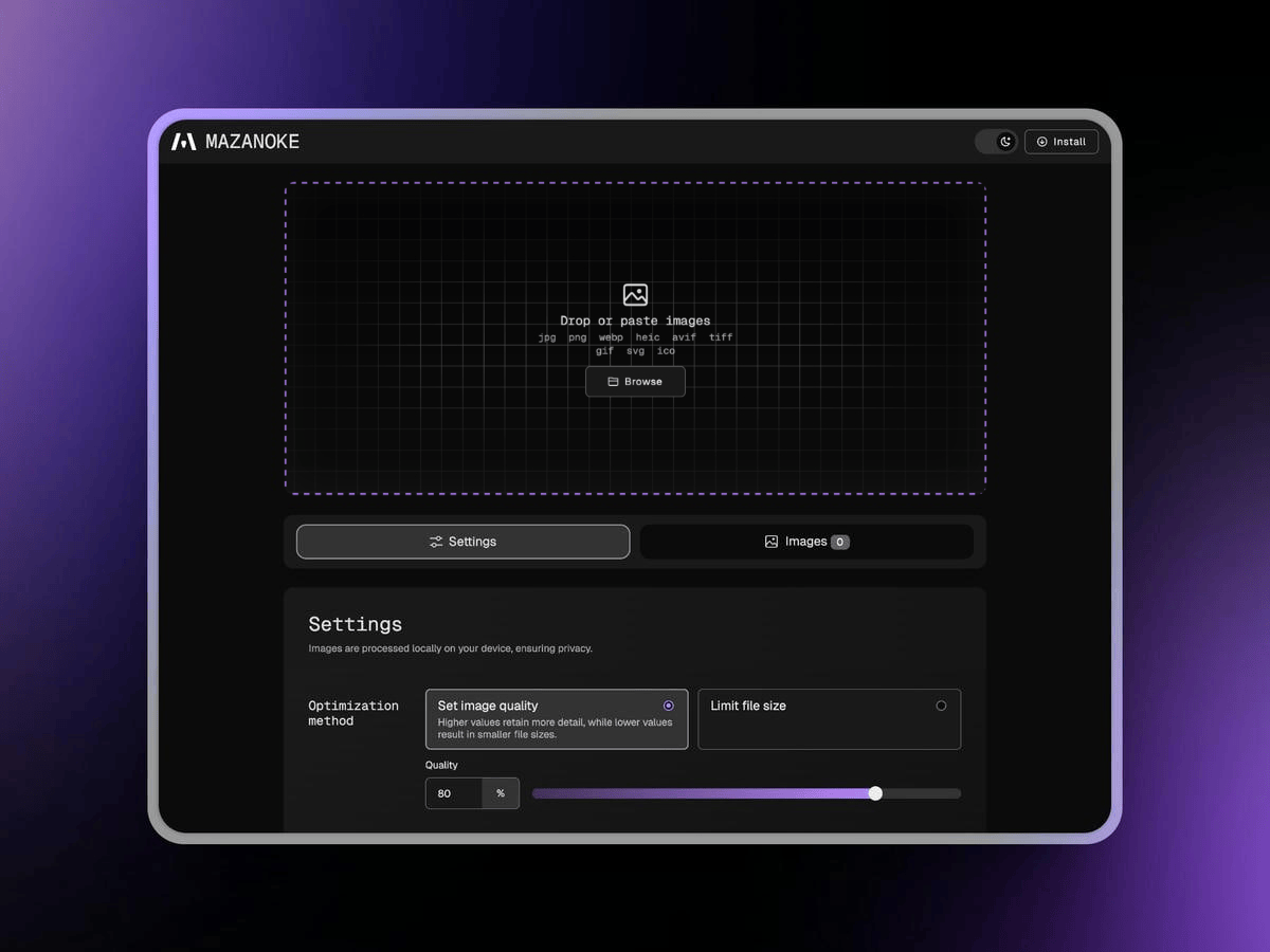 MAZANOKE 是一款简单易用的图片优化工具,可在浏览器中运行,支持离线使用,并确保您的图片始终保留在本地设备上,不会上传至任何服务器。