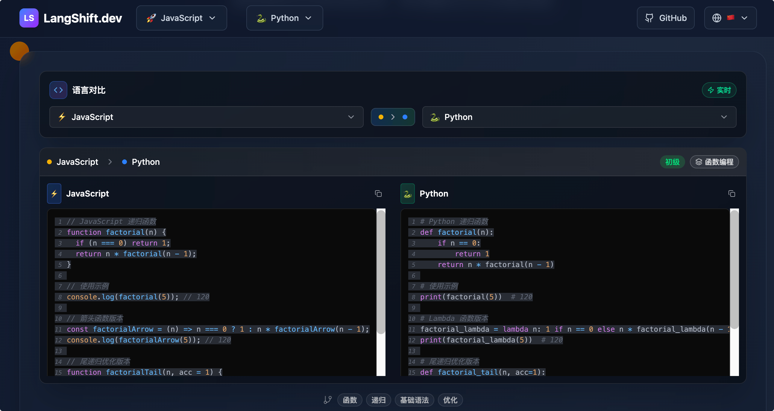 并排对比语法差异,直观理解语言特性,完全免费
