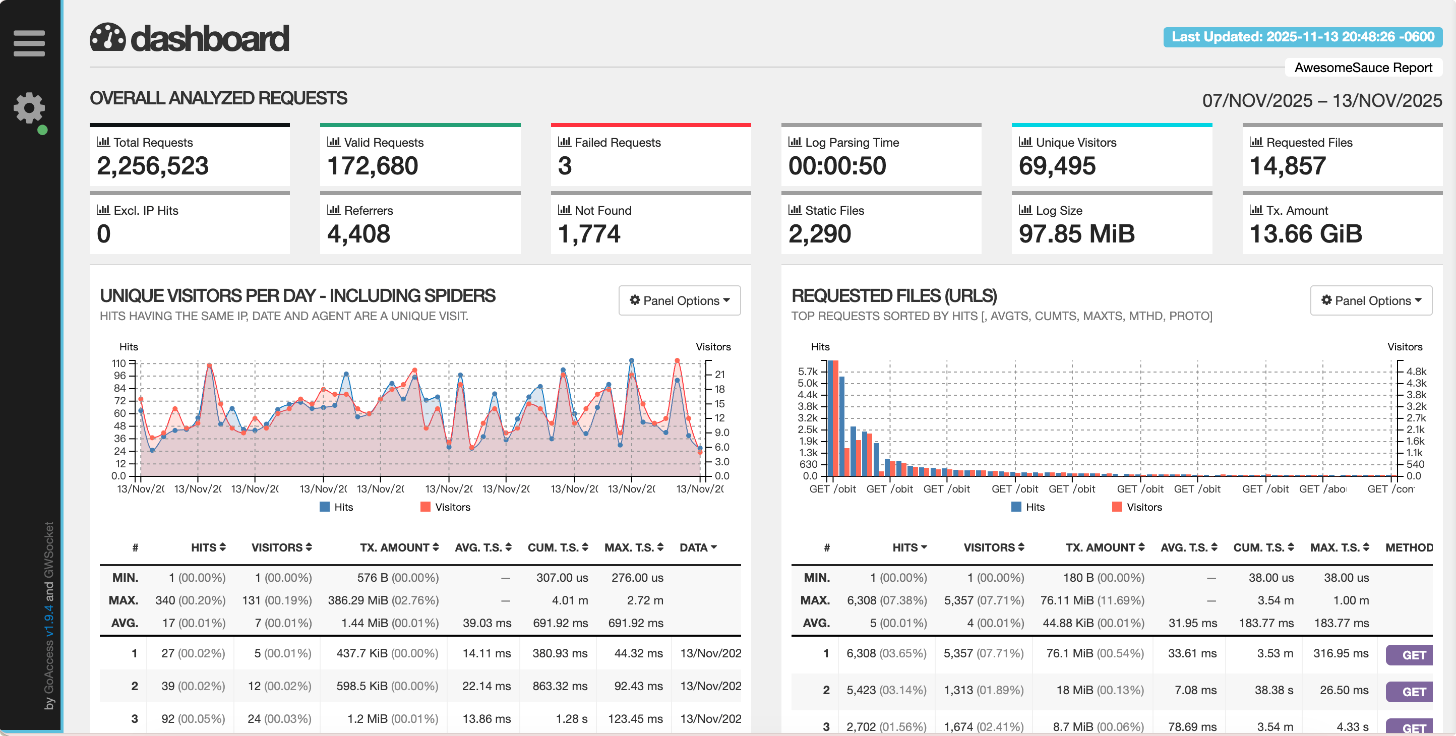 GoAccess 提供增强的 WebSocket 身份验证,支持本地和 外部 JWT 验证,具有安全的令牌刷新功能和无缝 与外部身份验证系统集成。 - 几乎所有 Web 日志格式GoAccess