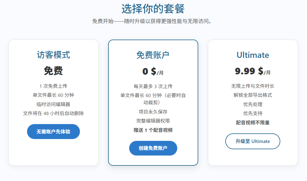 无论是社媒发布、专业剪辑还是无障碍场景,导出格式覆盖所有需求。简单、灵活、随处可用