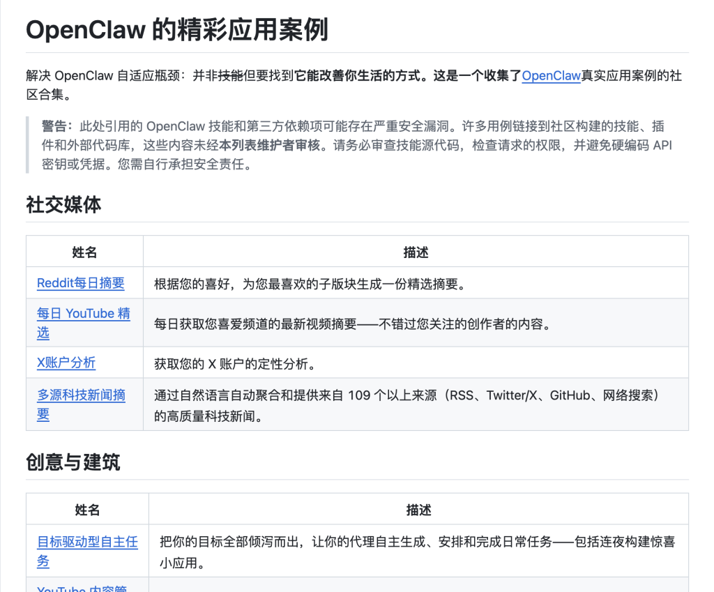 警告:此处引用的 OpenClaw 技能和第三方依赖项可能存在严重安全漏洞。许多用例链接到社区构建的技能、插件和外部代码库,这些内容未经本列表维护者审核。请务必审查技能源代码,检查请求的权限,并避免硬编码 API 密钥或凭据。您需自行承担安全责任。