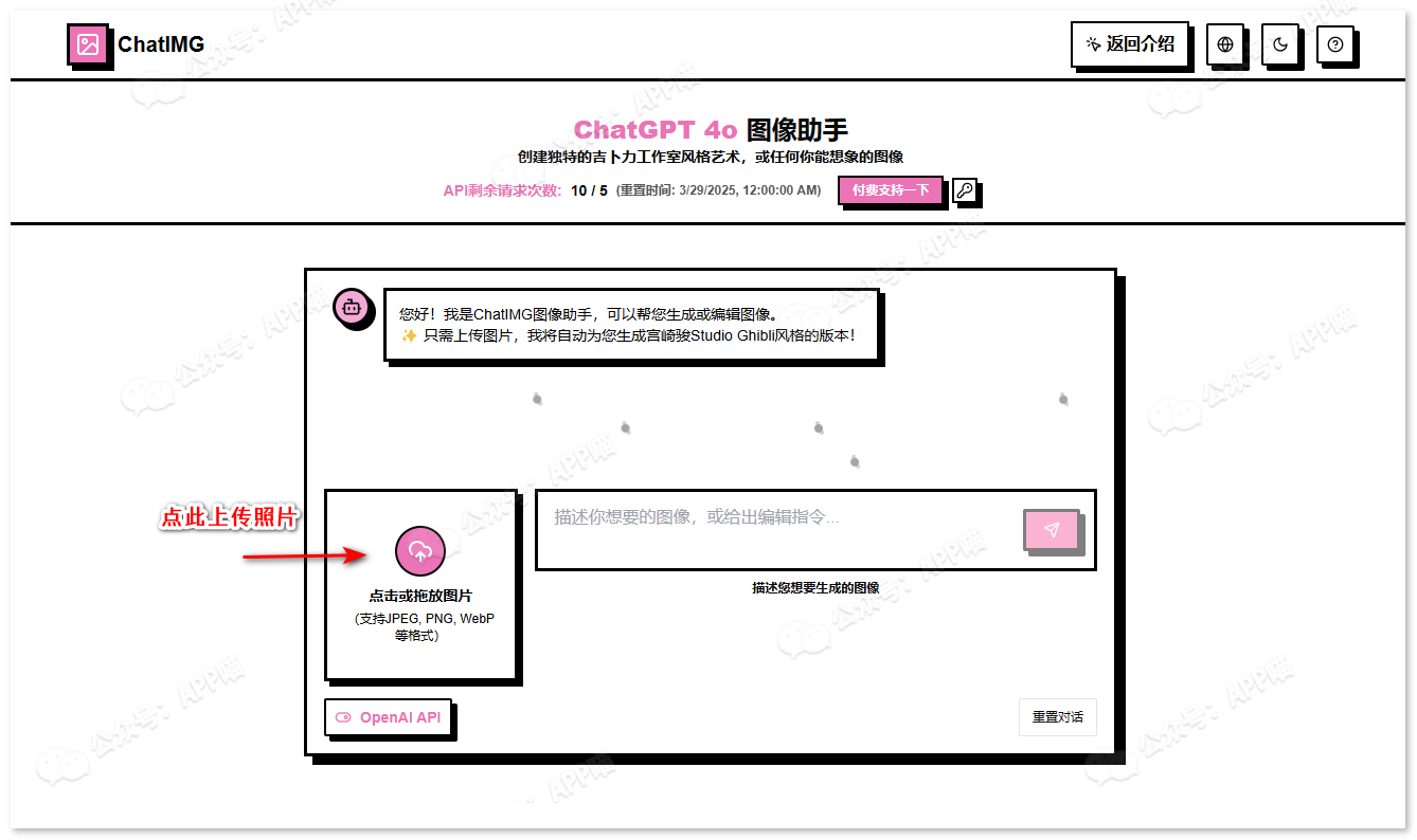ChatIMG:ChatGPT 4o 图像助手,创建独特的吉卜力工作室风格艺术,或任何你能想象的图像。✨ 只需上传图片,我将自动为您生成宫崎骏Studio Ghibli风格的版本!