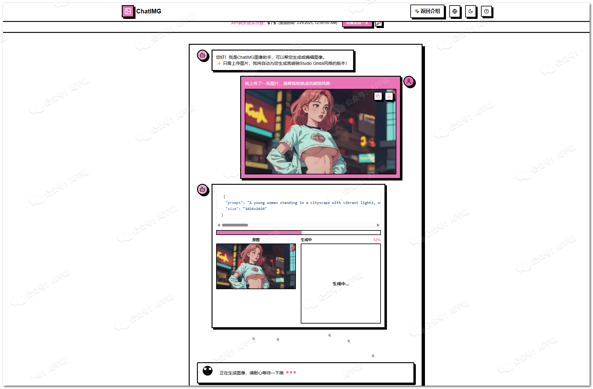 不过免费用户使用chatGPT只能生成图像,却无法转换图像。就在很多人去咸鱼9.9元卖生成图资源的时候,有开发者已经制作了可以一键生成宫崎骏Studio Ghibli风格图像的网站 – ChatIMG