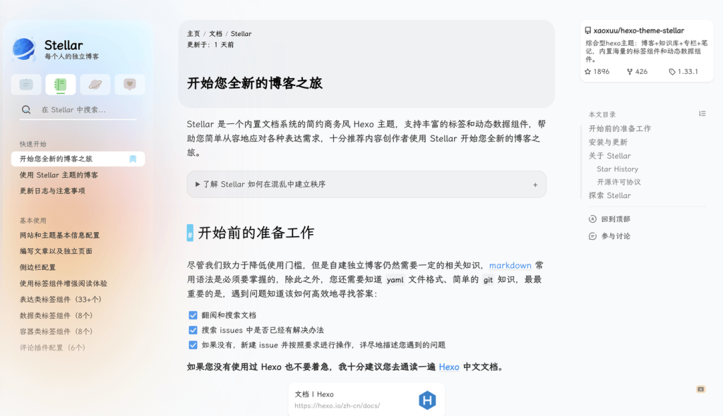 Stellar 是一个极为强大的综合型 Hexo 主题,包含博客系统、知识库系统、专栏系统、笔记系统,内置海量的标签和动态数据组件。