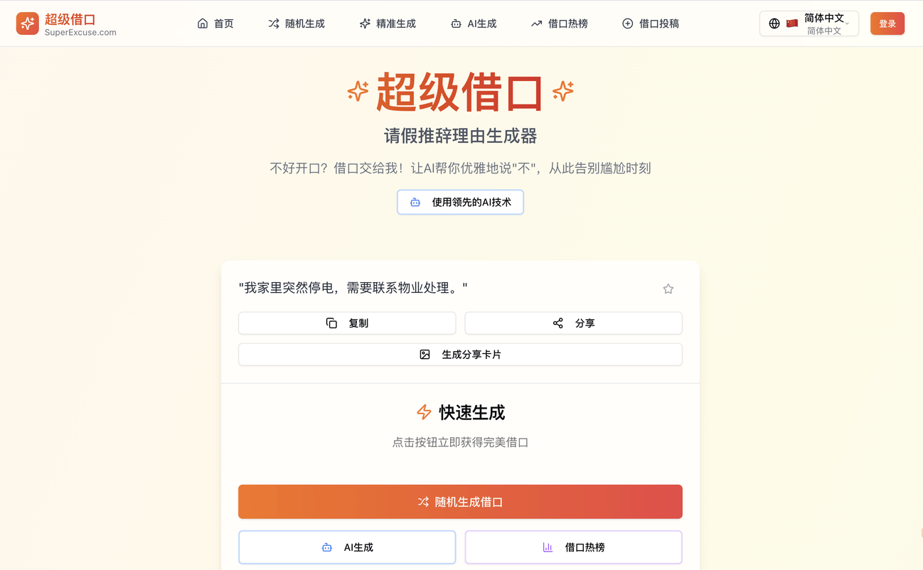 今天阿喵就给各位老铁推荐一款脑洞大开的职场神器——超级借口(SuperExcuse)。它能帮你生成各种天衣无缝的请假和推辞理由,让你彻底告别想借口的烦恼,把精力留在更重要的摸鱼和生活上。