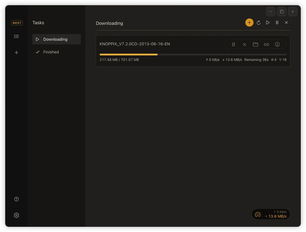 - 添加任务:点击侧边栏的“+”号,直接粘贴下载链接或者拖入 BT 种子文件。