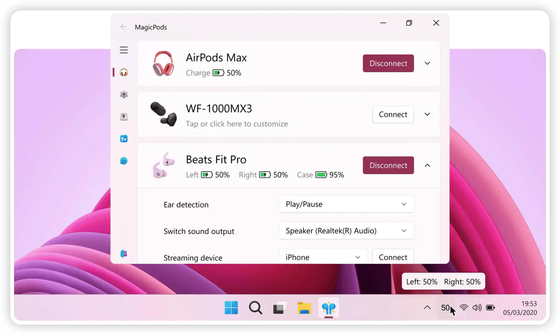 电量实时监控:在系统托盘、动态磁贴甚至 Windows 小组件里,你都能随时看到耳机和盒子的精准电量,彻底告别电量焦虑。