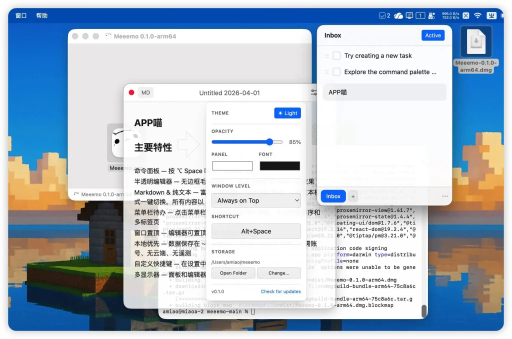 Meeemo 是一款集成了笔记、任务管理(TodoBar)和文本编辑功能的 macOS 原生工具。它采用本地优先的设计理念,支持实时的 Markdown 渲染,让你在轻量级的悬浮窗中就能完成复杂的排版和思考。