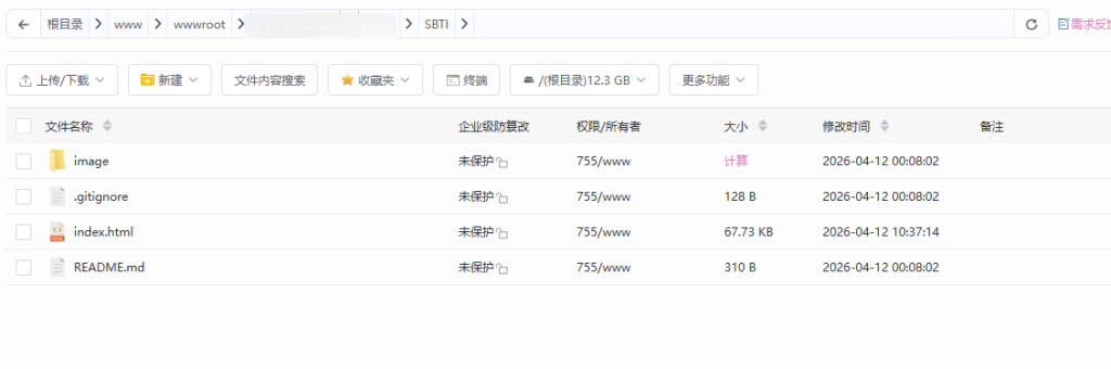 如果你要部署到服务器,就把文件直接上传到你网站的某个目录下,比如网站根目录下SBTI文件夹,那么访问就直接在域名后加/SBTI/index.html,如果你不想带上index.html,则把index.html改为index.php,直接访问 域名/SBTI/ 即可