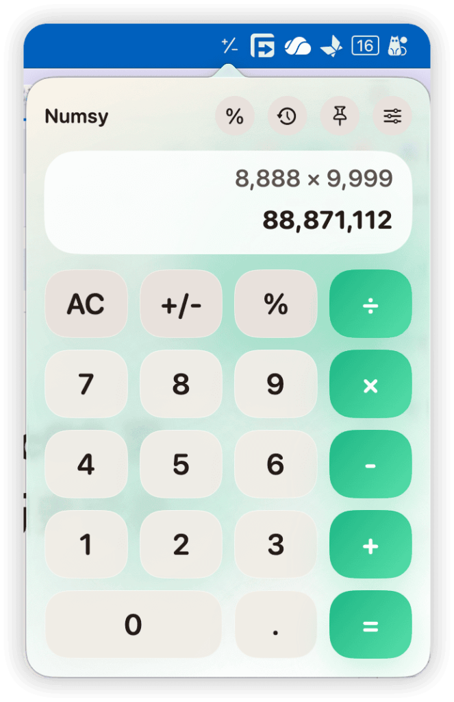 Numsy 是一款原生为 macOS 打造的轻量级计算工具。它将计算器完整地集成到了系统菜单栏中,省去了在不同应用程序间反复切换的麻烦。除了颜值极高之外,它还加入了历史记录管理功能,解决了传统便携计算器“转头就忘”的痛点。