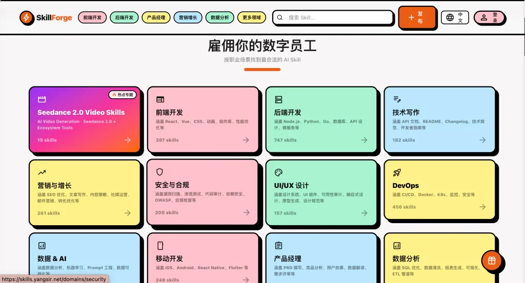 这是一个专门为打工人量身定制的 AI Agent Skill(智能体技能)发现与分发平台。不同于传统的“提示词大全”网站,它的核心逻辑是“按职业场景分类”。无论是程序员、新媒体运营、HR 还是产品经理,你都能在这里找到属于你这个岗位的专属“AI 外挂”。