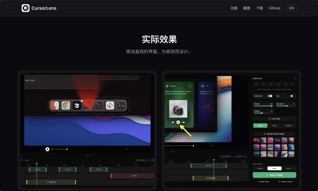 它的核心理念是将“枯燥的录屏”转化为“精美的视觉展示”。录制完成后,你不需要具备任何专业的视频剪辑技巧,只需要在可视化界面中拖拽滑块、勾选参数,就能轻松实现鼠标轨迹平滑、关键操作自动缩放放大、以及为视频添加各种具有设计感的唯美背景。无论是用于发布 Product Hunt 推广、制作 GitHub 项目的 Readme 动图,还是日常的哔哩哔哩视频教程,CursorLens 都能极大地提升视频的专业度和观赏性。