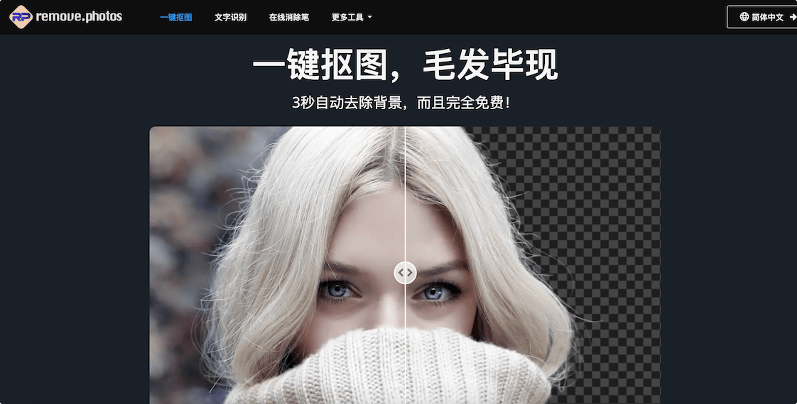 remove.photos,在线一键抠图工具,完全免费,无需登录。支持3秒自动去除背景,快速获取透明背景图,替换背景,还可以自定义背景,背景虚化和黑白等滤镜效果。
