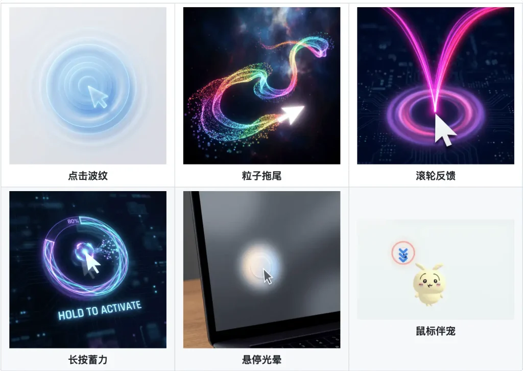 - 🎯 五条独立效果通道 — 点击、拖尾、滚轮、长按、悬停,不是换皮,而是独立能力面