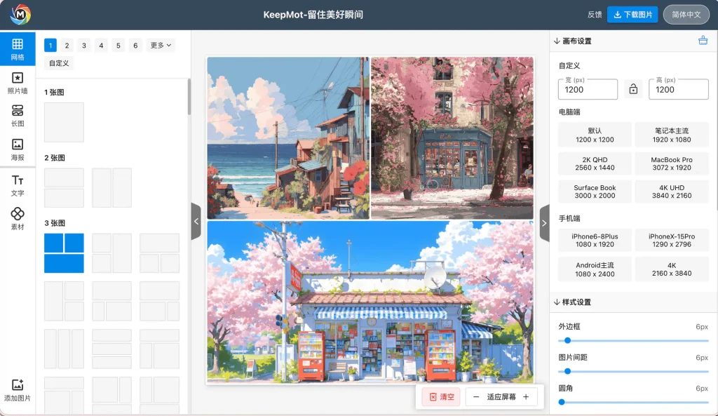 Keepmot 拼图(ps.keepmot.com)是一款极其轻量化的在线图片处理工具站。支持网格拼图、图片压缩、照片墙制作、长图拼接和图片裁剪等核心功能。可自定义尺寸、边框、间距、背景、水印等样式,拼图完成后,可一键复制或下载为 PNG / JPG 图片,免费无广告,无需注册。