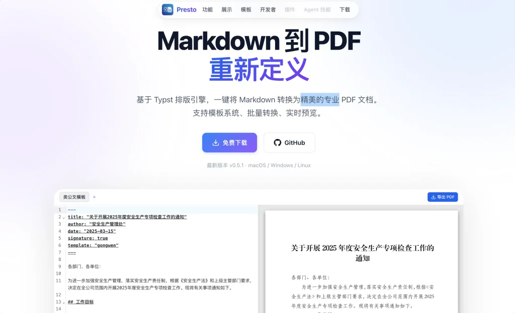 Presto(presto.mre.red)是一个专注将 Markdown 文本渲染并转换为 PDF 格式的网页工具。拖拽 .md、.txt 文件或 .zip 包到窗口即可打开或批量导入,系统会自动套用预设的排版样式,让你直接导出一份结构清晰、排版美观的 PDF 文档。