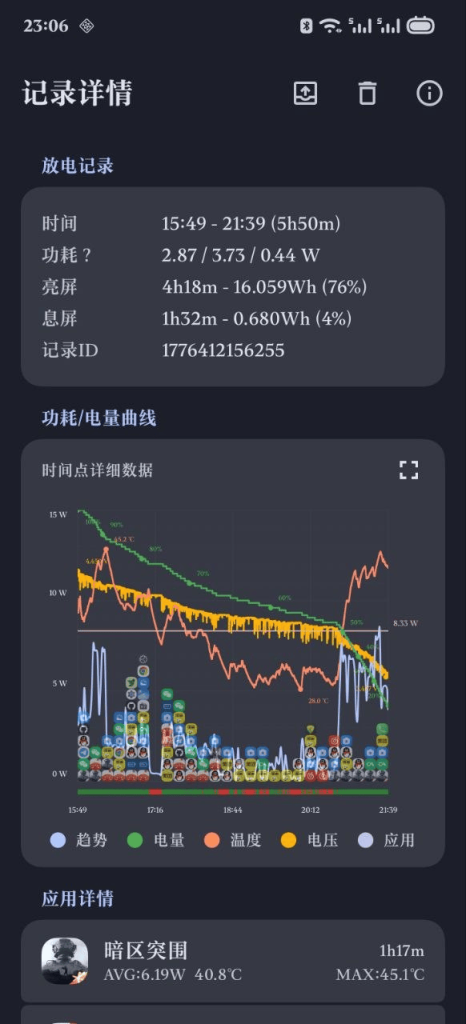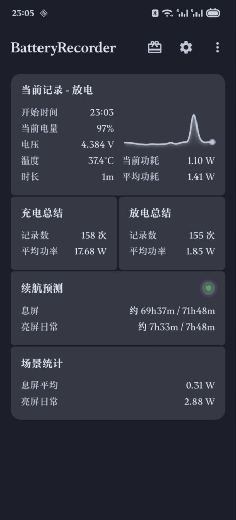 - 探索“未知场景”:很多人手机待机一晚掉电 10%,却查不出原因。BatteryRecorder 的息屏记录功能可以帮你复现那几个小时内的功率波动,定位具体的硬件或软件诱因。