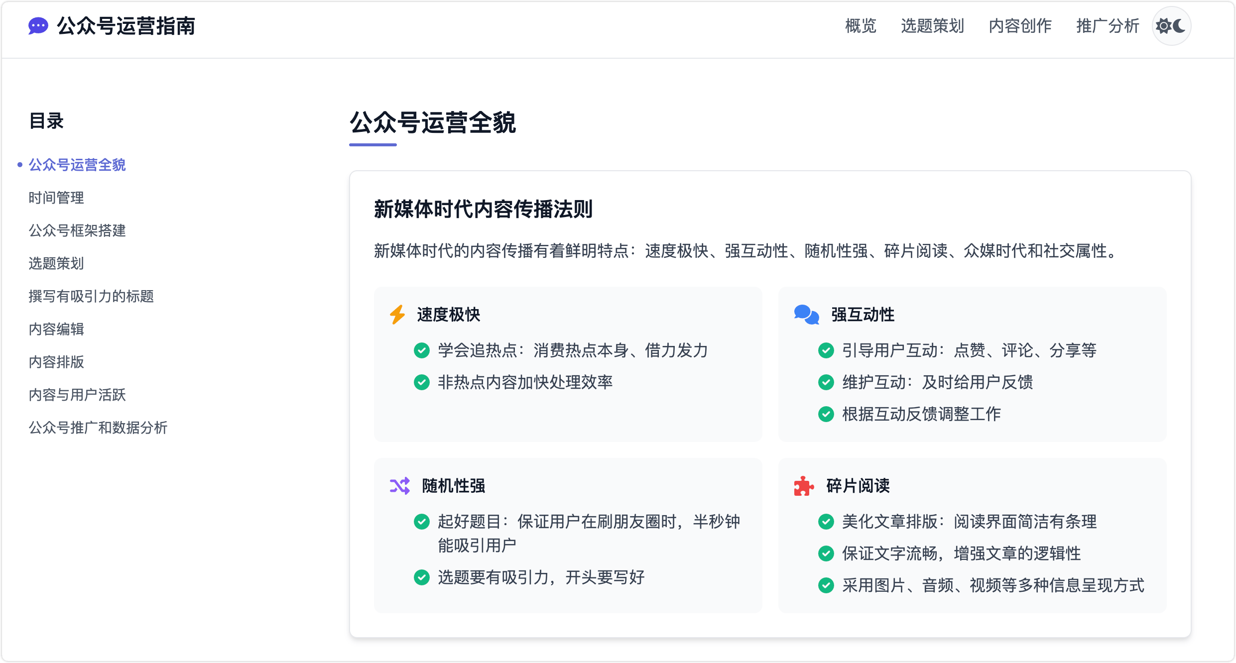 公众号运营全貌:新媒体时代内容传播法则,新媒体时代的内容传播有着鲜明特点:速度极快、强互动性、随机性强、碎片阅读、众媒时代和社交属性。