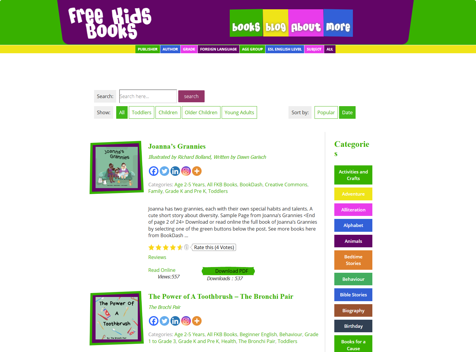 Free Kids Books 的界面简洁直观,方便用户浏览和搜索。你可以通过导航栏清晰地找到按年龄、阅读水平和主题分类的图书。每本书籍都有简洁的介绍和预览,方便你了解内容是否适合孩子。