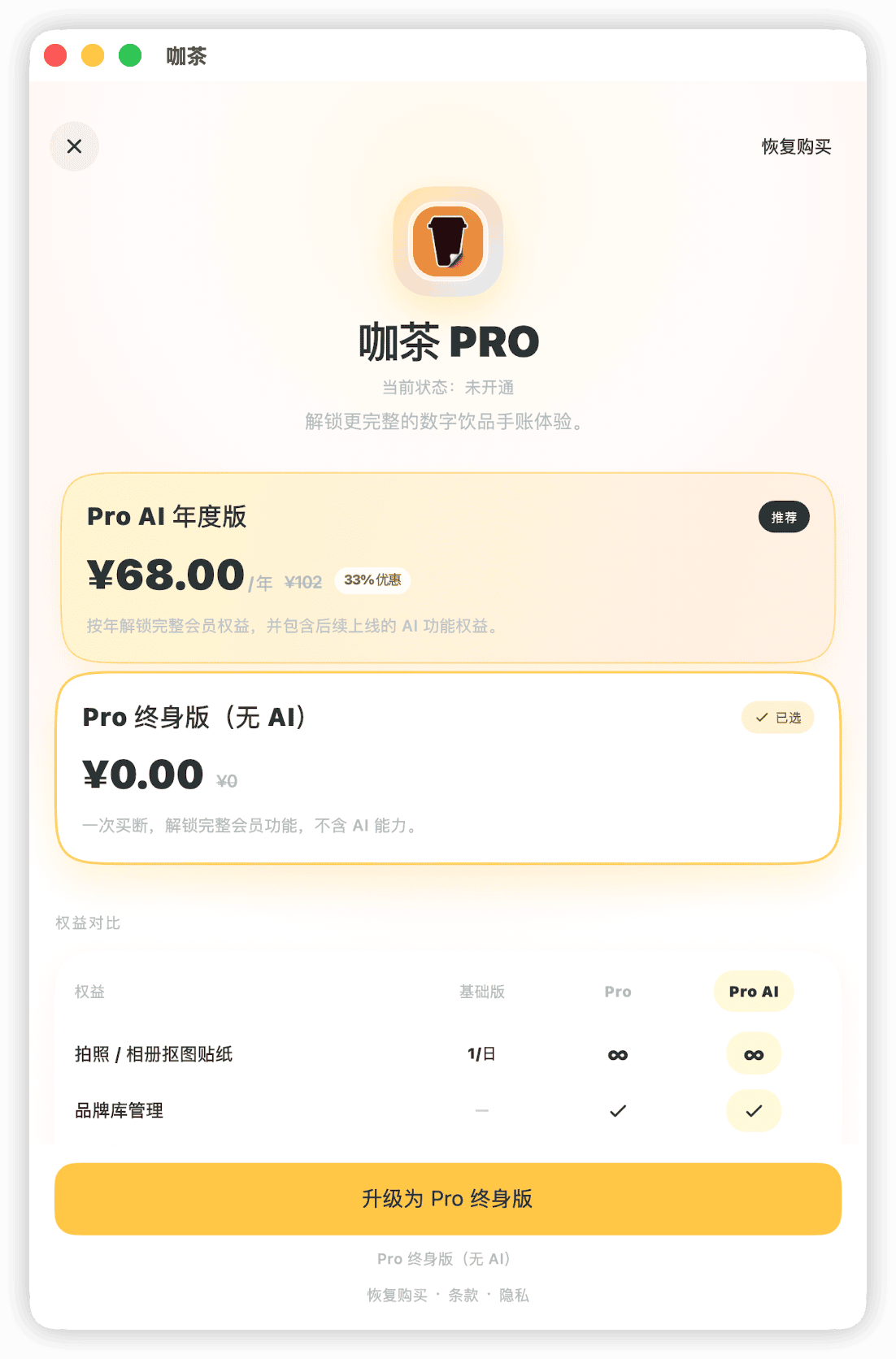 iOS限免:咖茶 - 咖啡、奶茶、饮品人手帐记录 AI贴纸 咖啡因 卡路里 热量 日历 记一杯