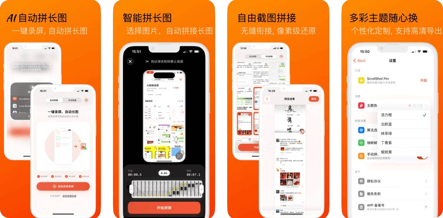 ·录屏即长图:无需手动截取数十张图片,通过系统录屏即可一键捕获完整页面。·智能缝缝合:动识别重合部分,精准像素级对,成的图然痕。·灵活截图拼接:除了录屏动合成,也持动选择多张截图进精度拼接。·全场景覆盖:完美支持微信聊天记录、页、红书、微博、知乎等内容保存。·极简审美:专为iOS设计,界面清新直观,没有任何上手门槛。